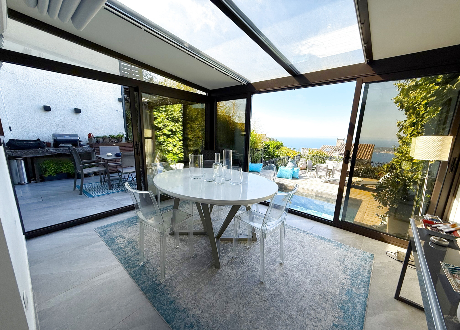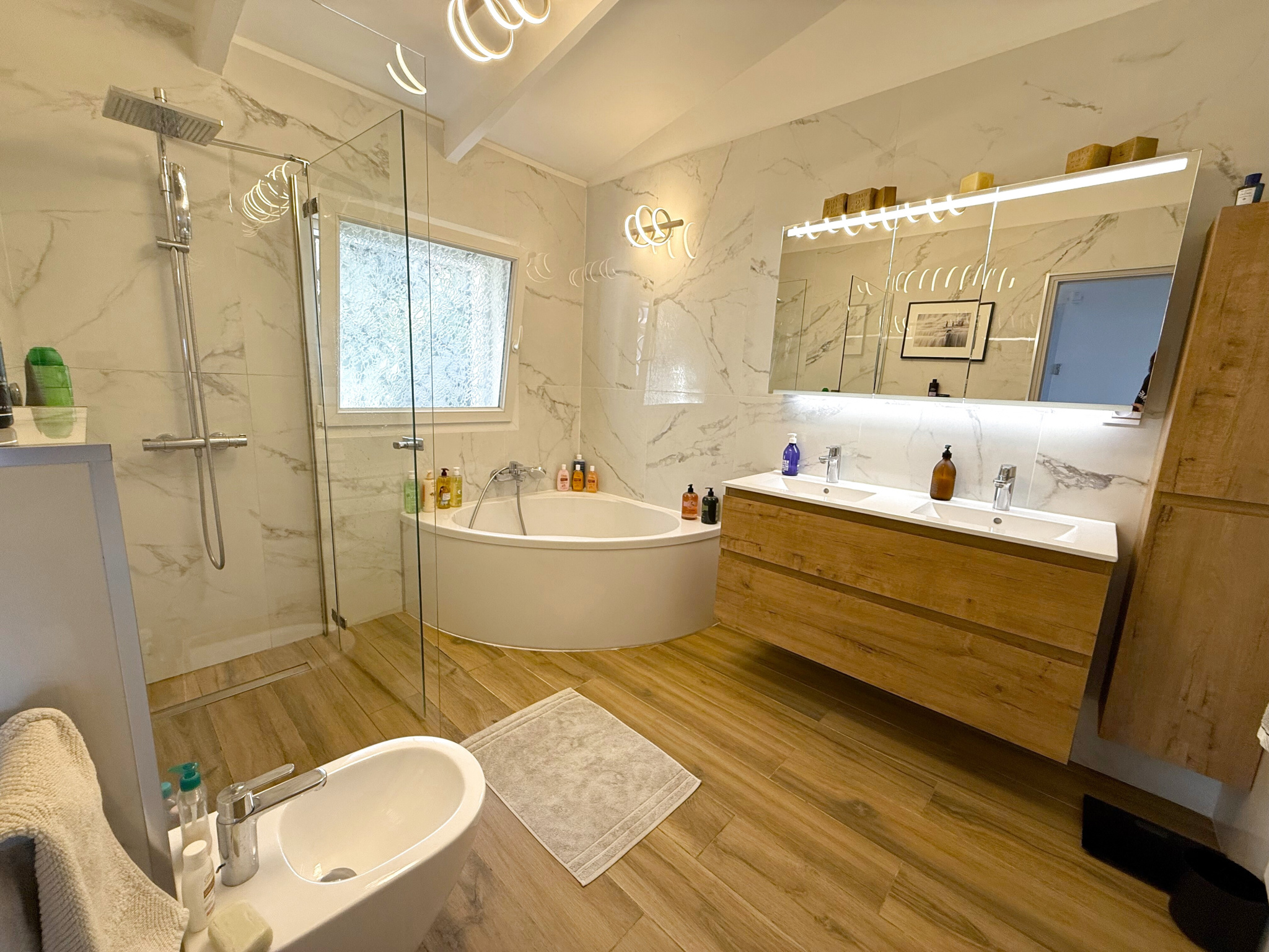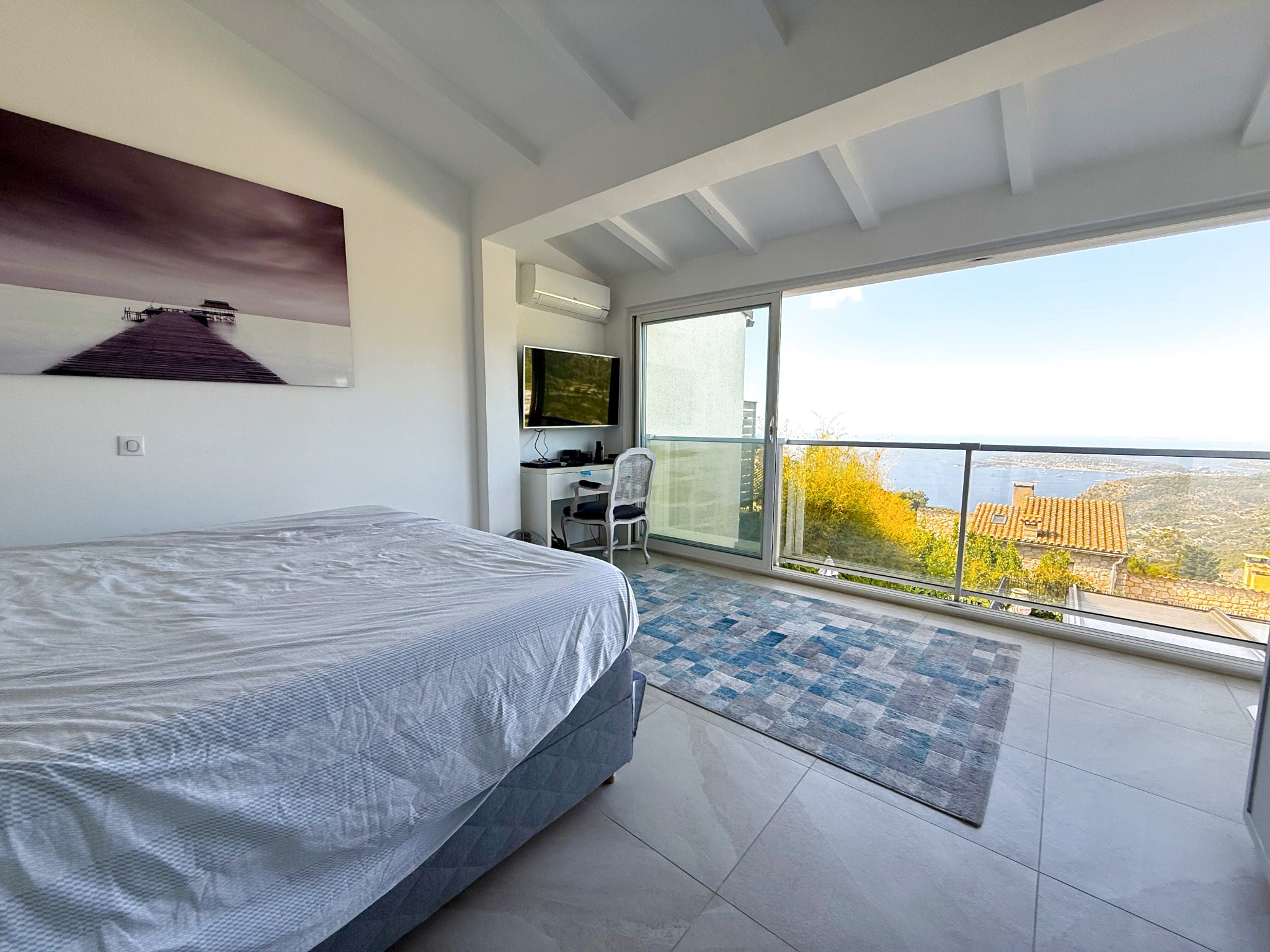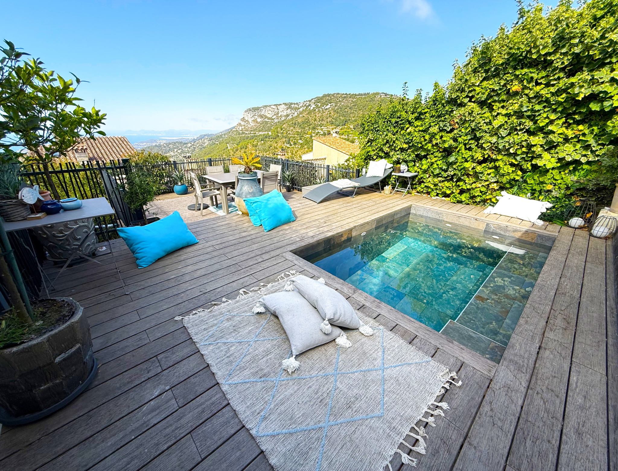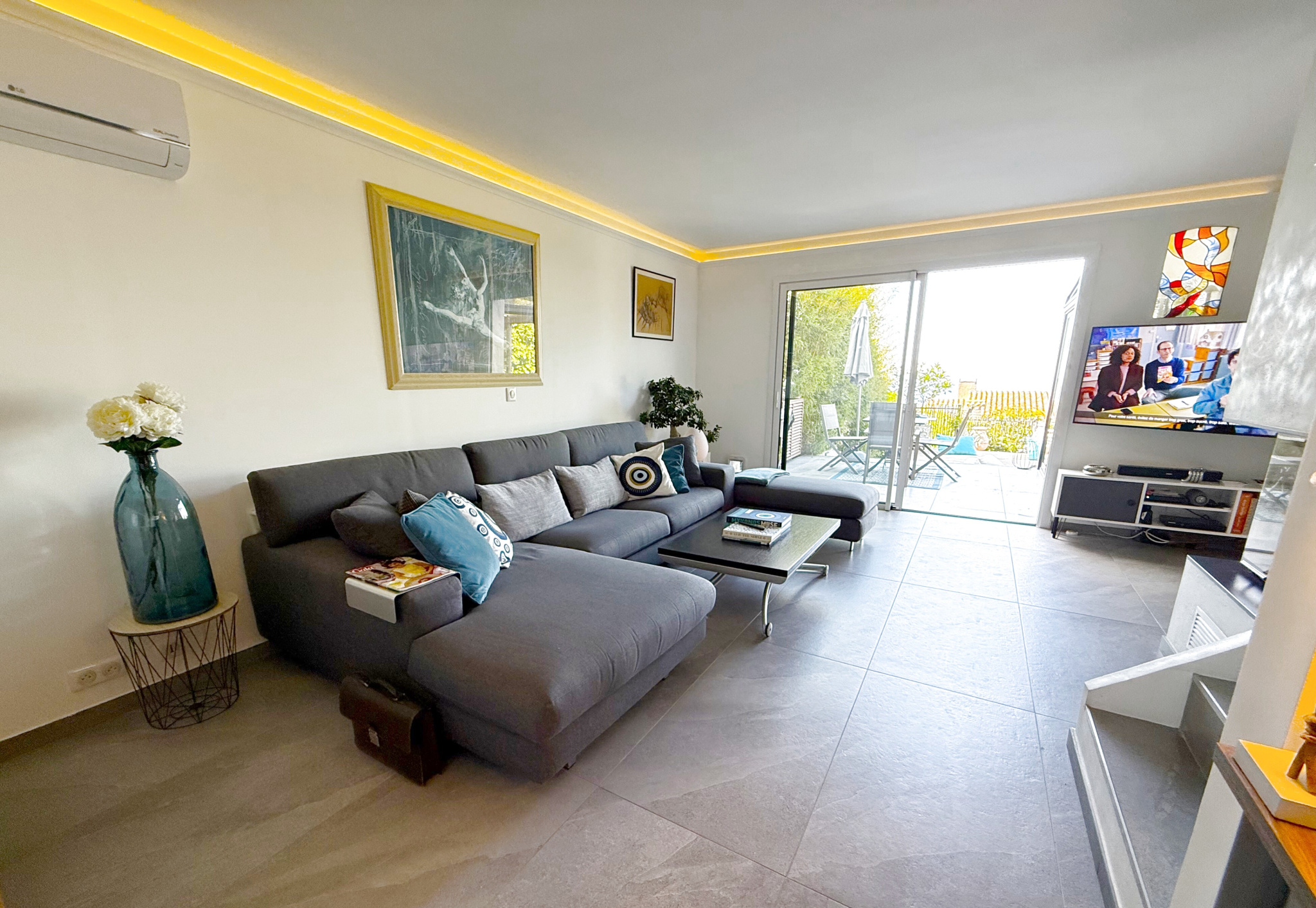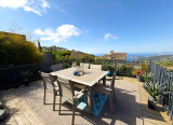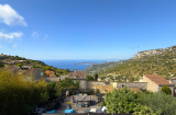 Dans le domaine privé et sécurisé des Hauts de Monte Carlo à La Turbie, ravissante villa jumelée de 110 m² sur deux niveaux. Vue mer panoramique jusqu'au Cap d'Anitbes. Belle exposition Sud. Au rez-de-jardin : séjour avec cheminée, cuisine entièrement équipée, cellier, salle à manger/véranda, WC invités, grande terrasse avec piscine chauffée. Au premier étage : deux chambres, dressing, salle de bain avec douche, baignoire et WC, buanderie, WC supplémentaire, atelier indépendant, charmante terrasse.