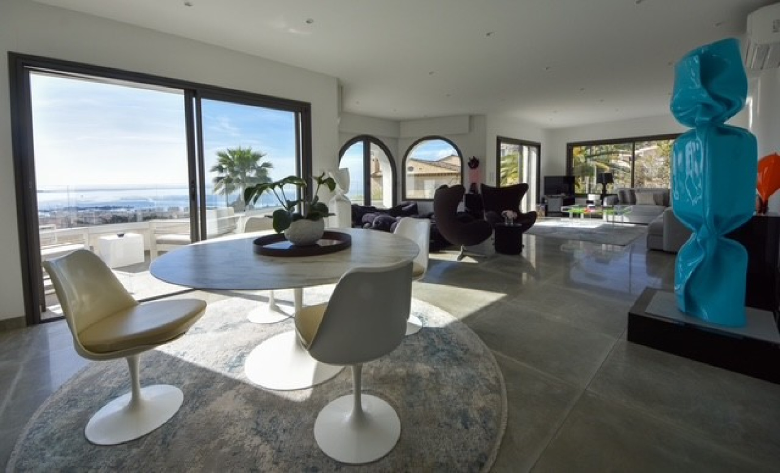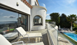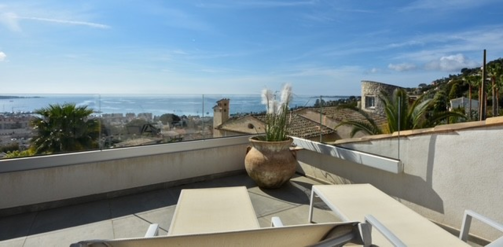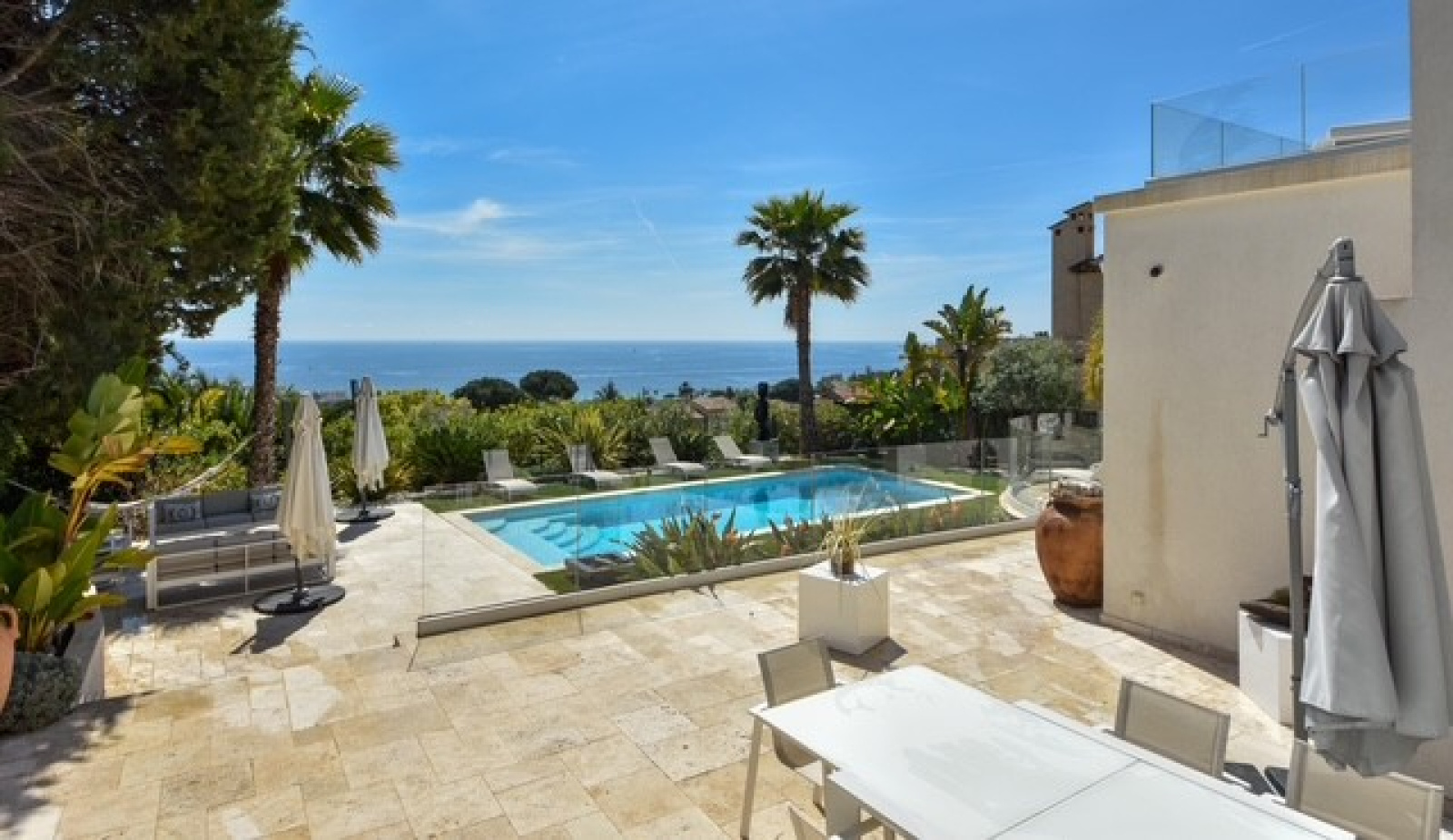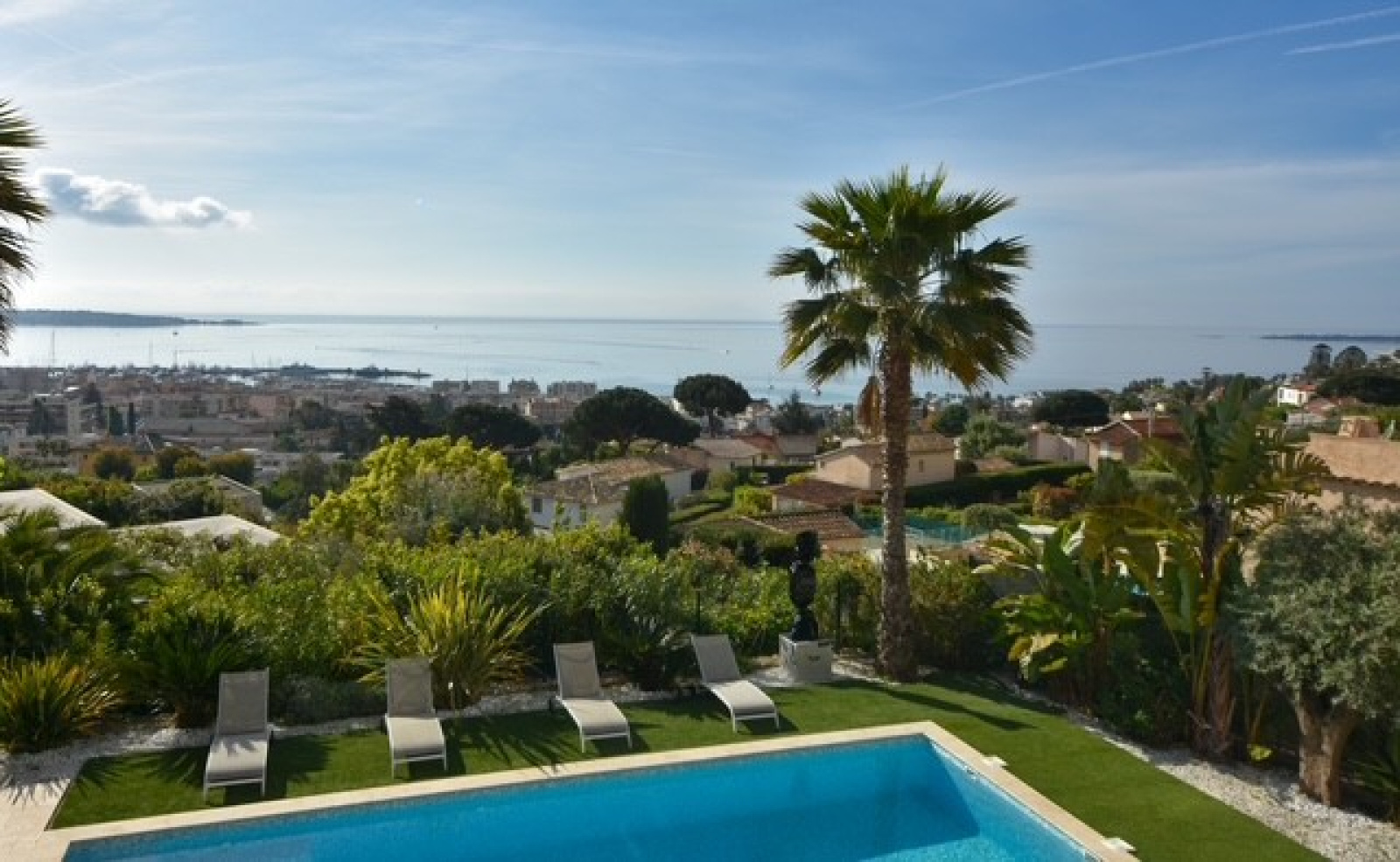 Magnifique villa entre Cannes et Antibes, vue panoramique exceptionnelle sur Cap d'Antibes et Cannes. 5 chambres. 5 salles de douche. Très grand living, cuisine ouverte entièrement équipée. Piscine, cuisine d'été. Large terrasse dominant la mer. Au calme, ensoleillé, proximité de la mer et des commerces, quartier résidentiel de Golfe Juan.
