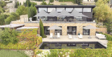 Rez-de-chaussée : Cuisine équipée ouverte, salle à manger contemporaine, salon/séjour design, donnant sur grande terrasse. Prestations haut de gamme, confort et modernité. WC invités.